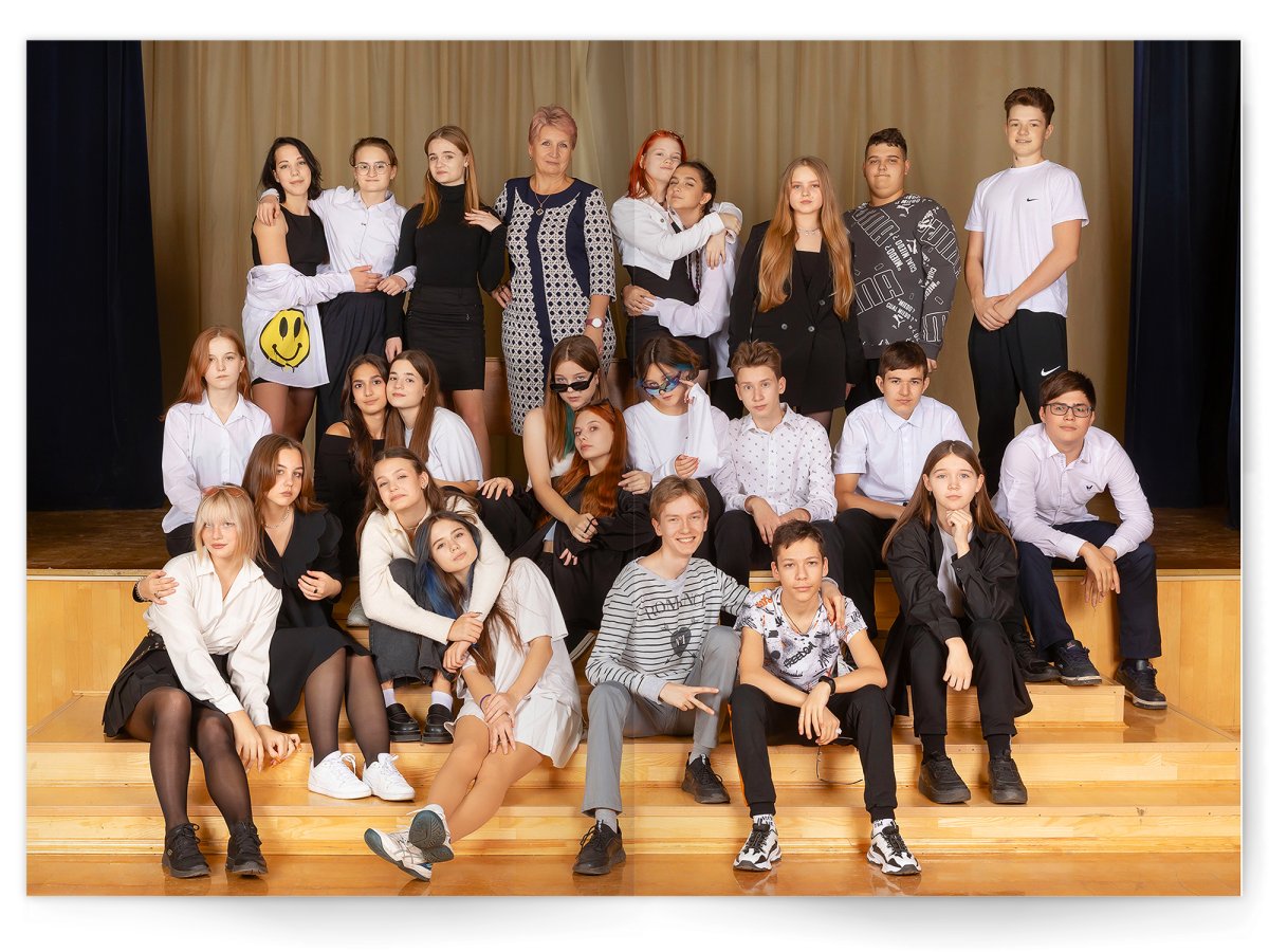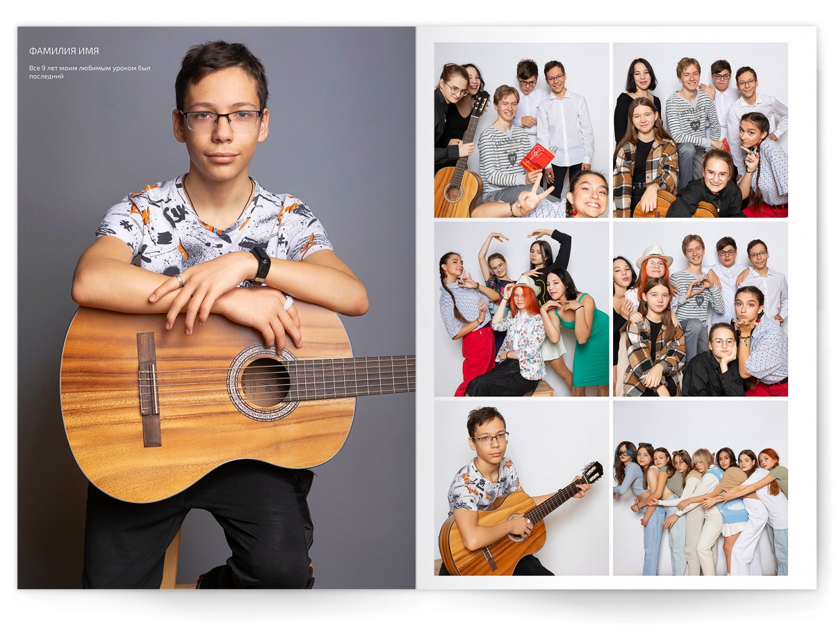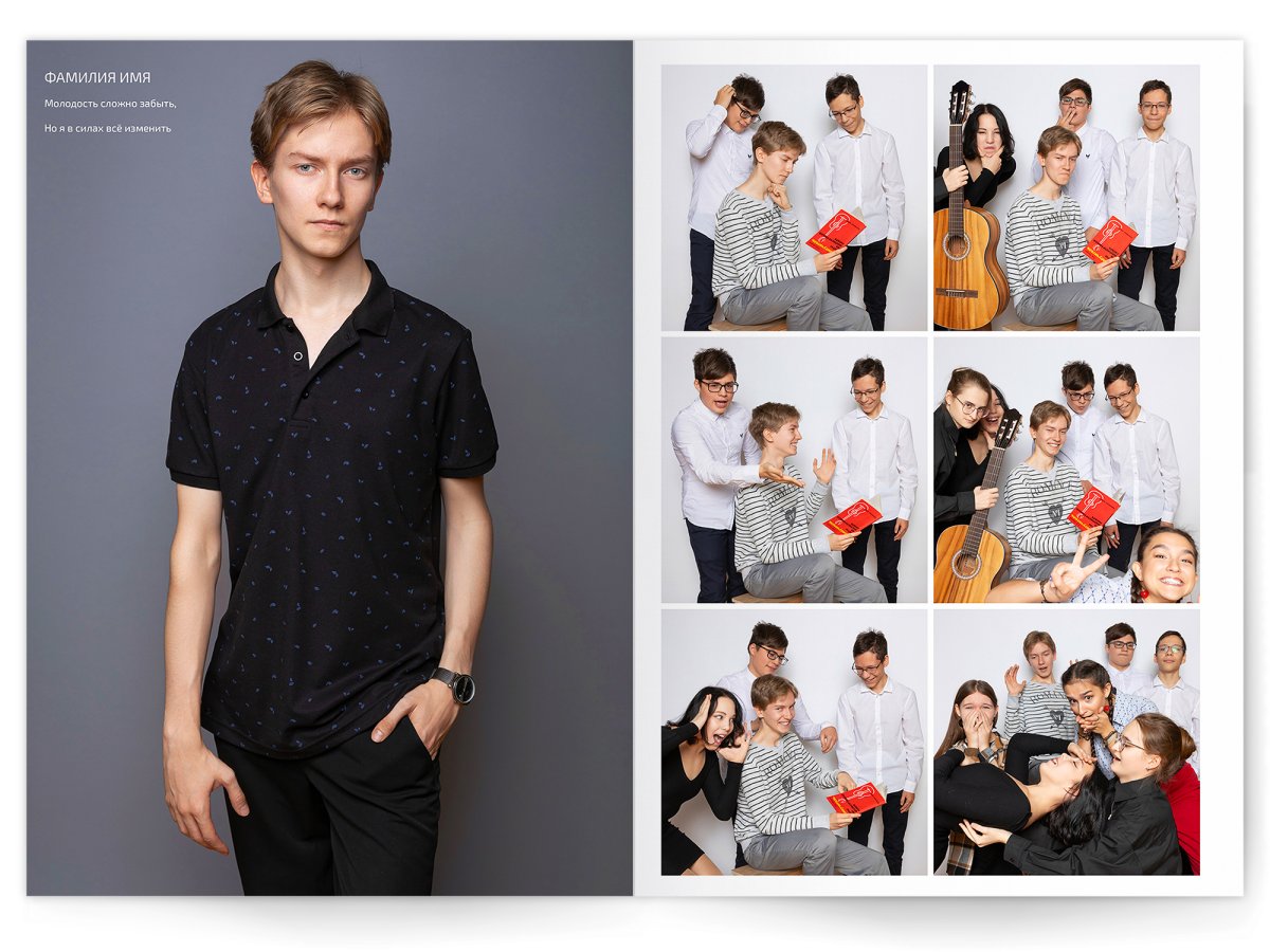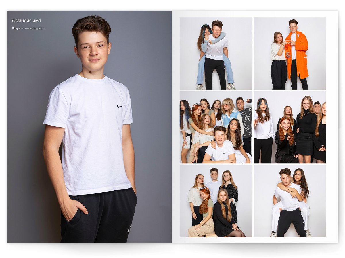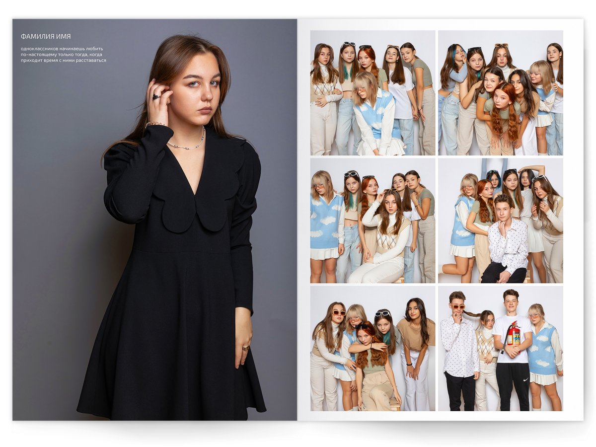 • Портреты всех одноклассников и все учителя, которые придут на съёмку на развороте