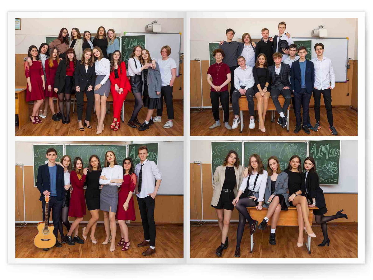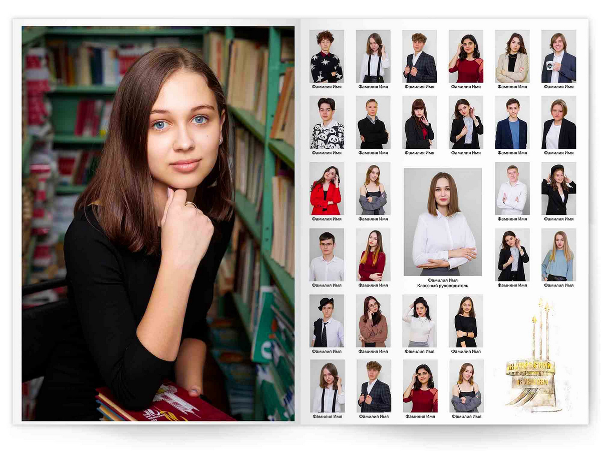 • Портреты всех одноклассников и все учителя, которые придут на съёмку на развороте