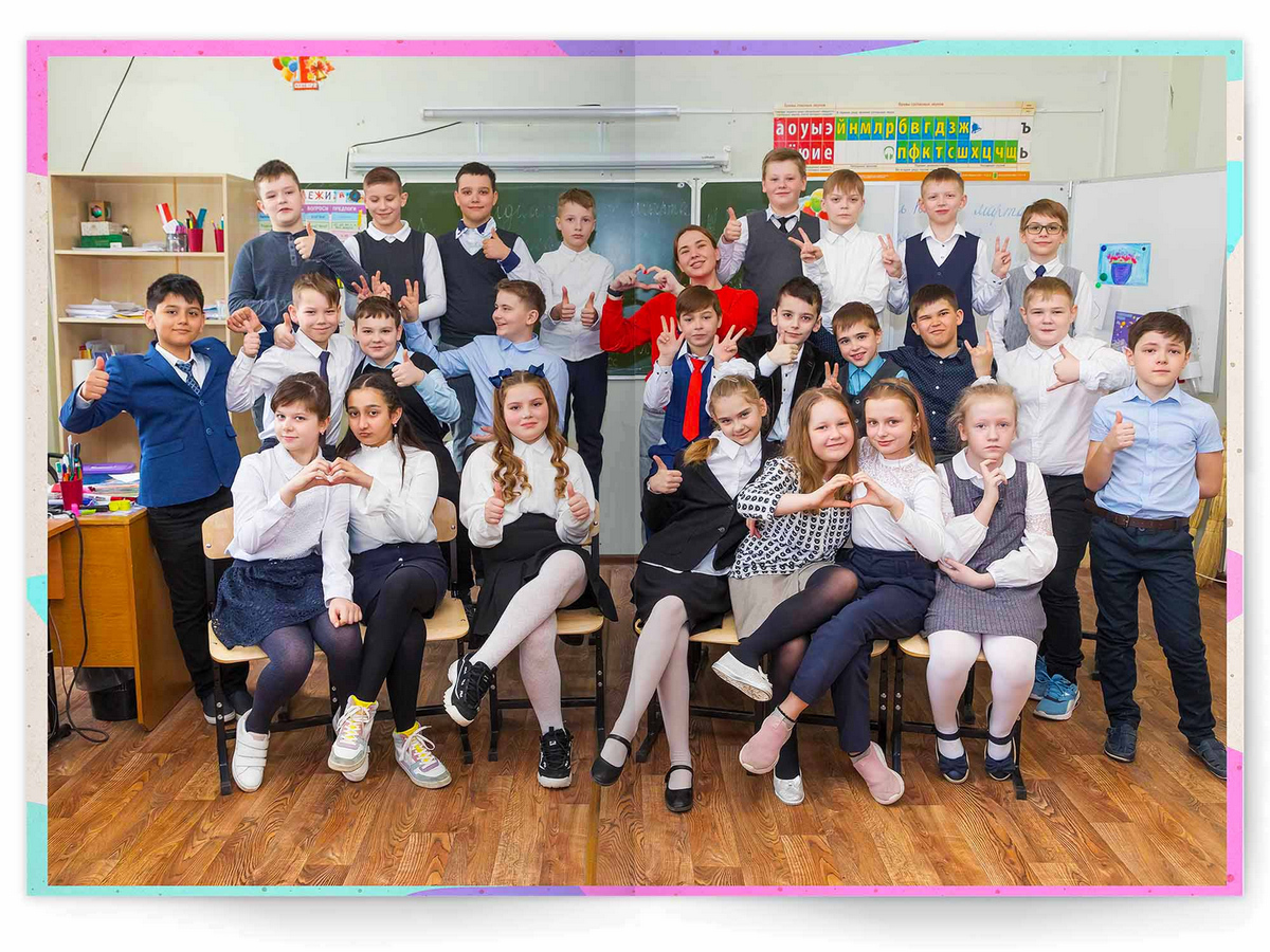 • Можно добавить общее фото всего класса на разворот +350 ₽