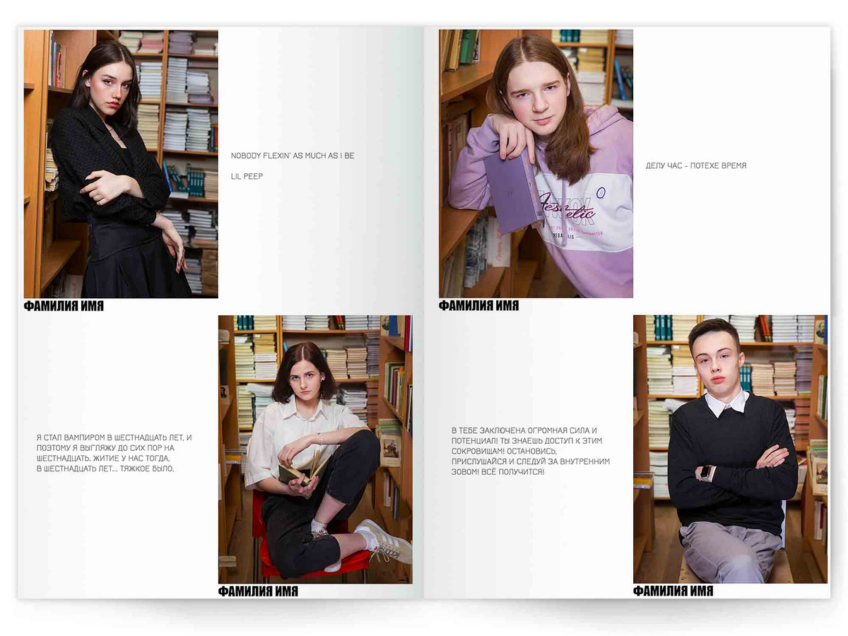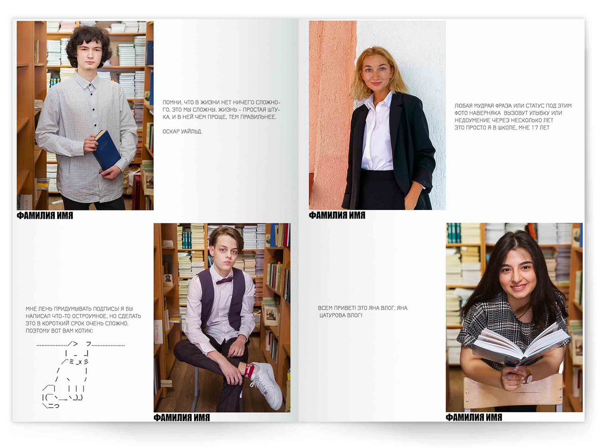• Портреты всех одноклассников по 2 человека на страницу с историями-заметками, цитатами для выпускного альбома