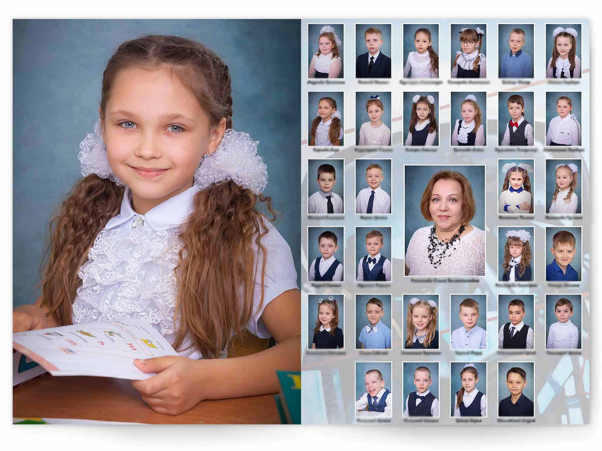 • Портреты всех одноклассников и классного руководителя на развороте или второй портрет на всю страницу слева, справа портреты всех одноклассников и классного руководителя