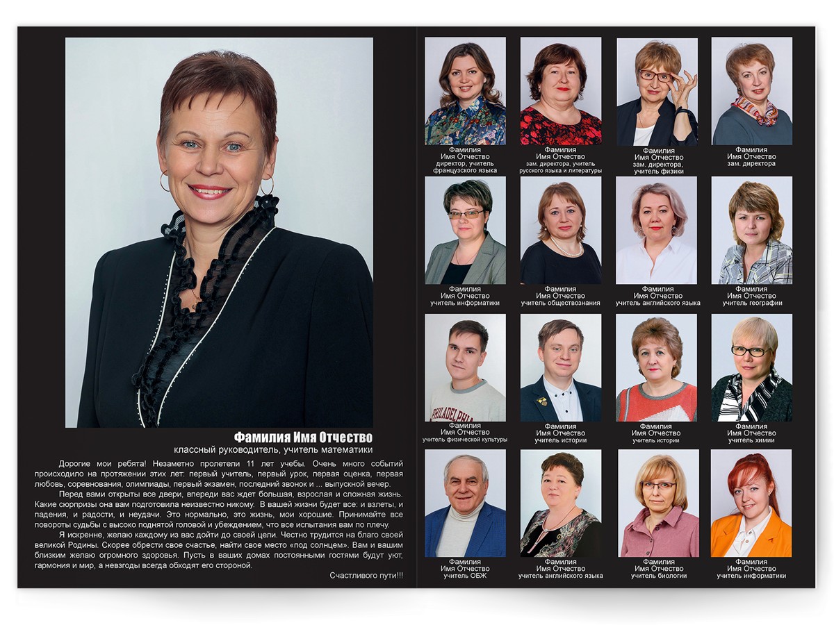 • Разворот с общей фотографией всего класса